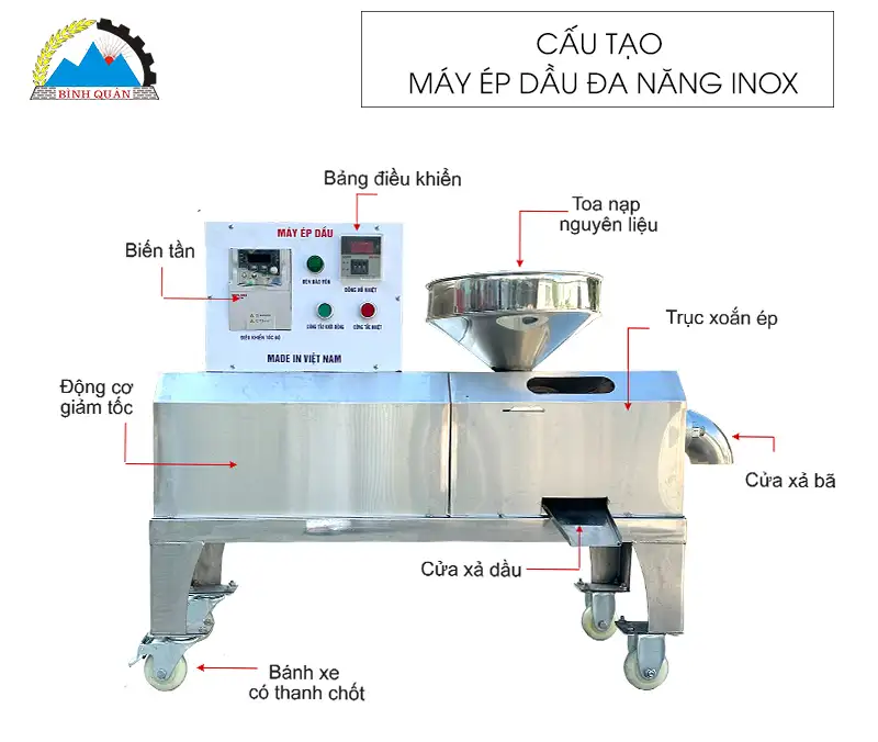 Máy ép dầu đa năng inox 20N phiên bản mới do công ty Bình Quân sản xuất - lựa chọn tối ưu giúp bà con kinh doanh tự sản xuất dầu ăn nguyên chất ngay tại nhà.
