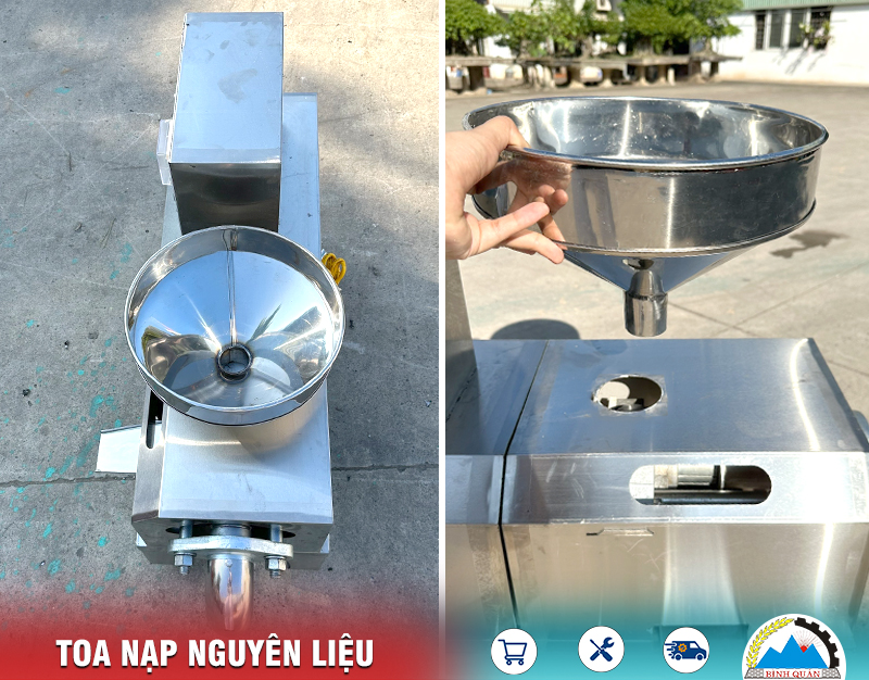 Toa nạp nguyên liệu được thiết kế trục đứng, phễu tròn làm bằng inox cao cấp, có thể tháo rời toa thuận tiện vệ sinh