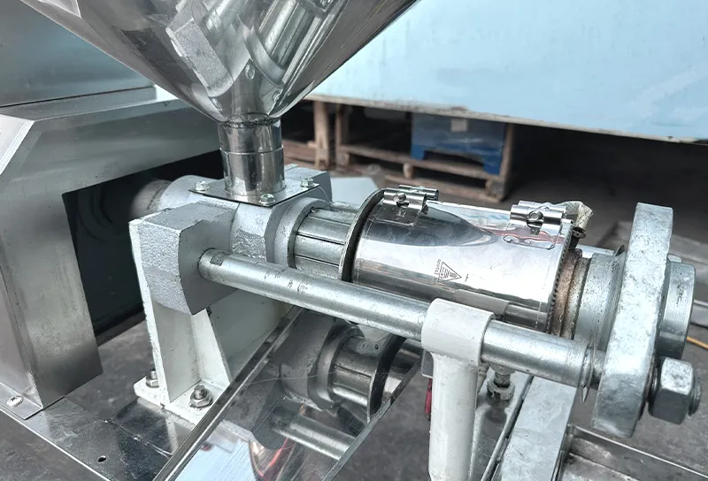 Trục ép lớn được thiết kế dạng xoắn chạy dọc thanh trục . Điểm khác biệt nằm ở 2 ốc siết ở đầu trục, người dùng có thể chủ động siết mặt bích ép kiệt bã hơn hay nới lỏng một chút nếu ép hạt cứng