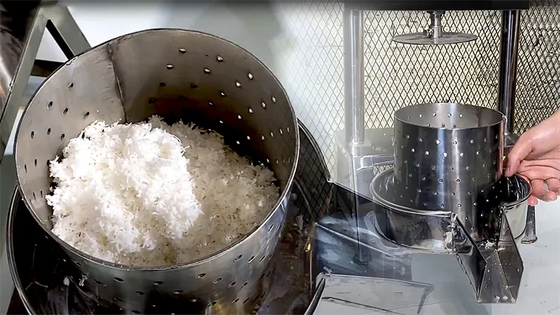 Nếu quý khách không trộn nước nóng khi ép sẽ không ra được hết nước cốt, do nước cốt dừa rất đặc.