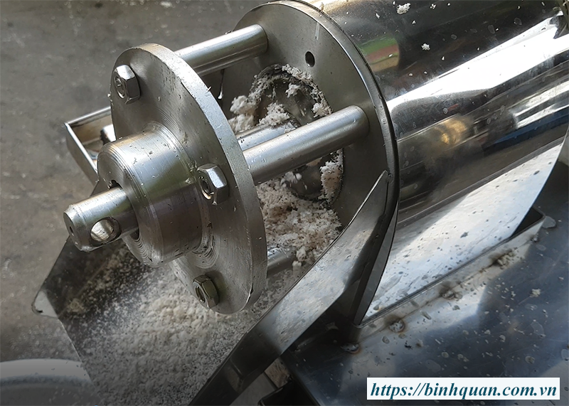 + Trục vít xoắn làm bằng inox thiết kế khuôn ép dạng ống với các vằn xoắn quanh trục, khi đưa dừa vào trục vít xoắn có tác dụng đẩy dừa tiến vào bộ phận ép.