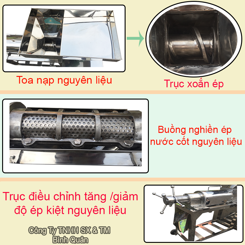 -    Máy được sản xuất trực tiếp tại Việt Nam của Công Ty Bình Quân hệ thống máy chạy êm, không gây tiếng ồn như các dòng máy ép nước cốt nhập khẩu khác.