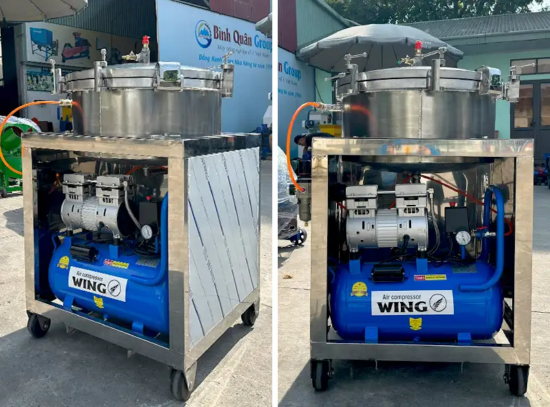 Sau đó, nén khí đẩy lượng dầu qua màng lọc (để lọc sạch mọi cặn bã cho ra thành phẩm lượng dầu trong)
