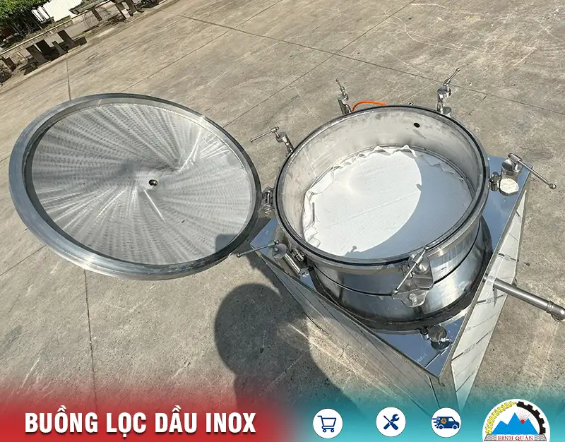 Xung quanh nắp đậy với 6 tay khóa chắc chắn cùng van xả khí, kết hợp máy bơm đẩy dầu qua màng lọc, giữ lại tạp chất hiệu quả qua túi lọc vải chuyên dụng, nằm trong buồng inox, từ đó:
