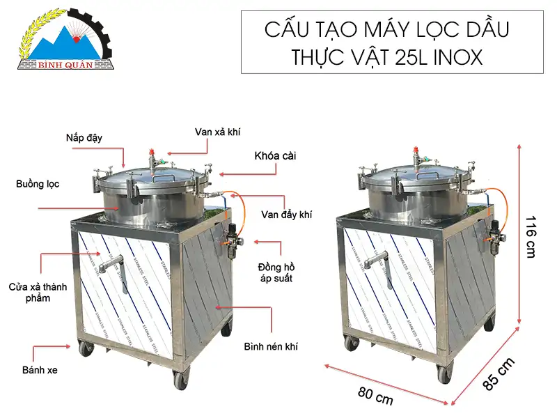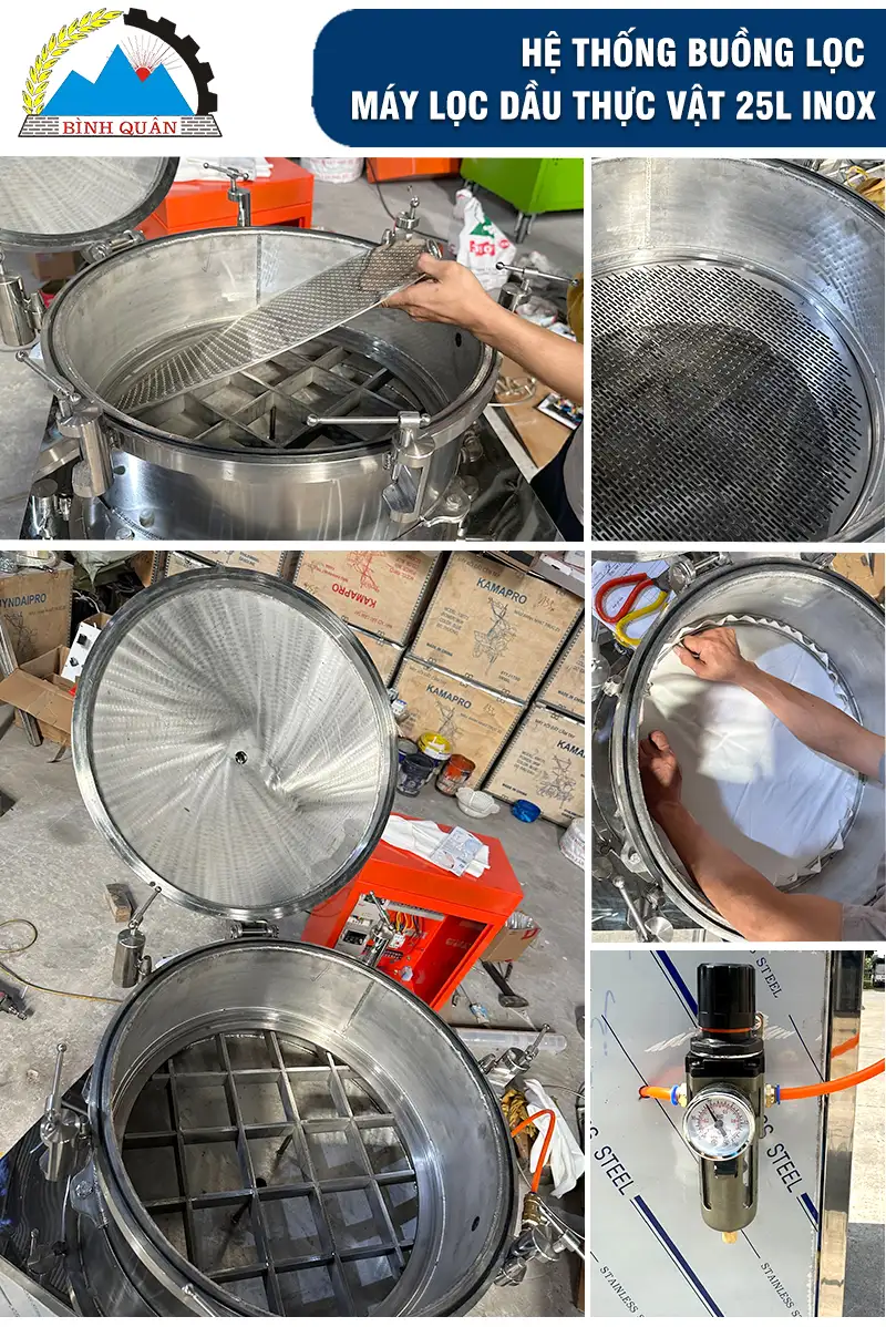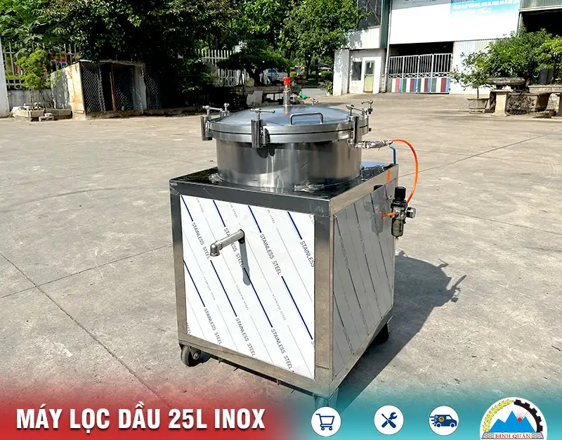 Máy lọc dầu 25L inox thiết bị hỗ trợ máy ép dầu do công ty Bình Quân sản xuất, chuyên dùng lọc cặn và tạp chất trong dầu ngay sau khi ép sạch tới 98%, ứng dụng đa dạng: