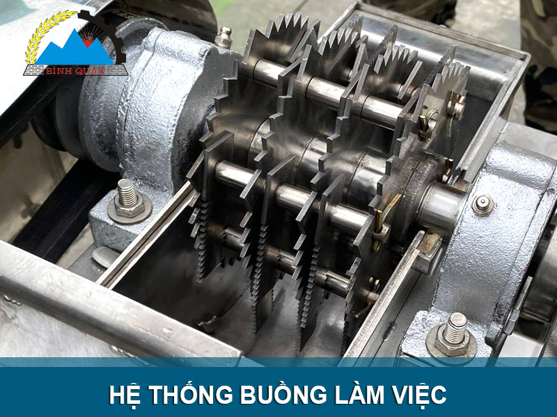 Nguyên liệu sau khi nghiền đi qua mặt sàng lắp trong máy. Đồng thời, dưới sử chuyển động của hệ thống búa tạo gió thổi bay thành phẩm qua ống dẫn sang bầu cắt gió một cách dễ dàng.