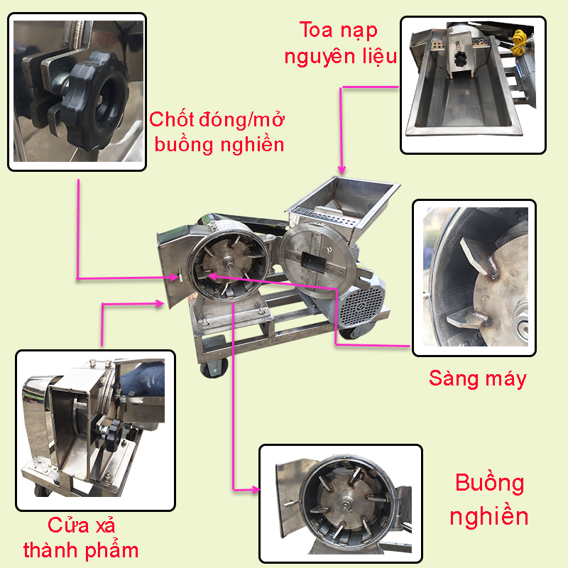 Toa nạp nguyên liệu có kích thước chiều dài 33cm * chiều rộng 22cm sẽ có nhiệm vụ chứa nguyên liệu thô sau đó nguyên liệu sẽ đi xuống theo cửa hút nguyên liệu. Nguyên liệu sẽ được hút và đi thẳng vào buồng nghiền.