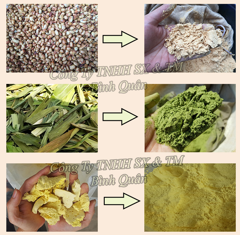Máy có chức năng nghiền mịn nhiều loại nguyên liệu như: mầm đậu nành, gạo, lá trà xanh, đỗ đen, ngô, tiêu và các loại ngũ cốc (có tỉ lệ độ dầu 5 – 10%),… cùng nhiều nguyên liệu khác nữa.