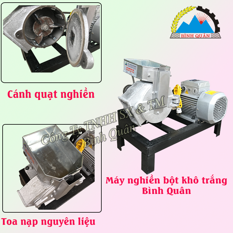 - Máy nghiền bột khô trắng được cấu tạo 3 cánh nghiền quạt có nhiệm vụ tạo lực nghiền nhỏ mọi loại nguyên liệu, sau đó khi nguyên liệu đã được nghiền nhỏ sẽ đi qua mặt sàng để có thể sàng lọc cho ra lượng bột mịn nhất theo yêu cầu người sử dụng.