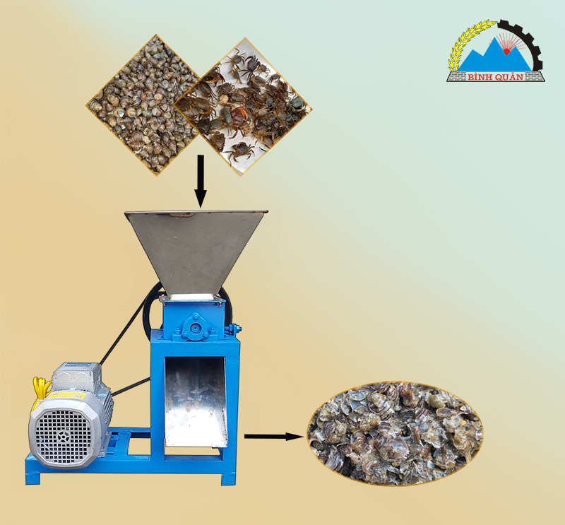 Máy có thể nghiền nát đa dạng các loại thủy hải sản có vỏ cứng như : cua, ốc bươu vàng, ốc vặn, trai, hến, sò, …..