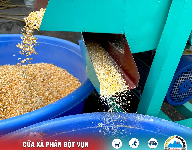 Nhờ đó, sàng sẽ sàng đều để lọc ngô mảnh ra cửa chính, còn bột mịn, bụi ngô được đẩy ra cửa phụ