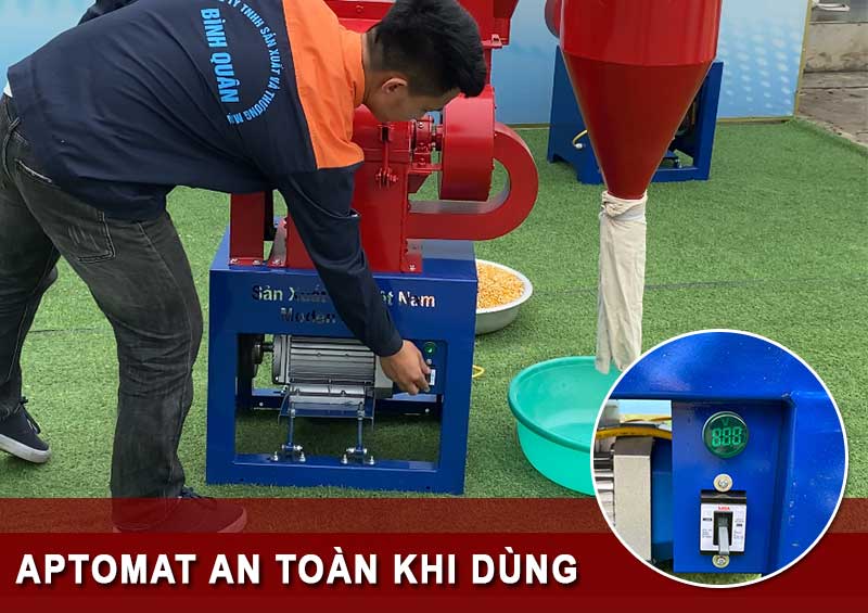 Bên thân máy được thiết kế cần gạt có thể khởi động tắt/mở tại chỗ. Trong quá trình xay nghiền, bà con có thể quan sát máy hoạt động ở cự ly gần và atomat sẽ tự ngắt khi nguồn điện dừng đột ngột .