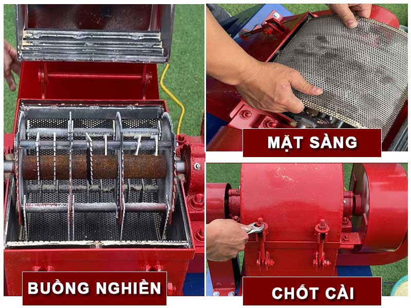 Ngoài mặt sàng lỗ được lắp cố định trong máy là sàng 2ly, bà con có thể đặt thay lắp thêm các mắt sàng có kích thước lớn nhỏ khác nhau để tạo thành phẩm bột cám đa dạng hơn.