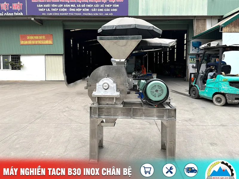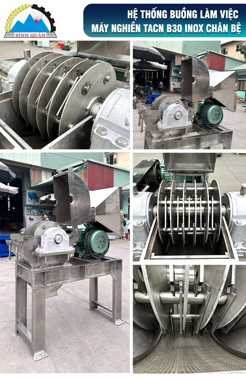 Máy nghiền thức ăn chăn nuôi B30 inox có chân bệ phiên bản mới với cửa xả trực tiếp do công ty Bình Quân sản xuất