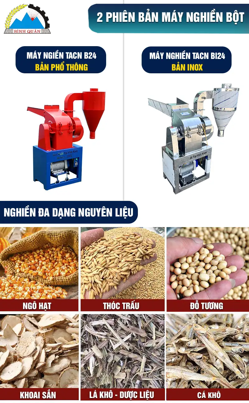 - Máy nghiền đa dạng nguyên liệu: nghiền bột gạo, bột ngô, bột dược liệu
