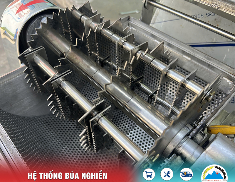 Bên trong máy nghiền được thiết kế gồm 24 búa nghiền chuyển động kết hợp với 4 đĩa đà và 9 búa cố định, làm nhiệm vụ đập vỡ và nghiền nguyên liệu với mặt sàng