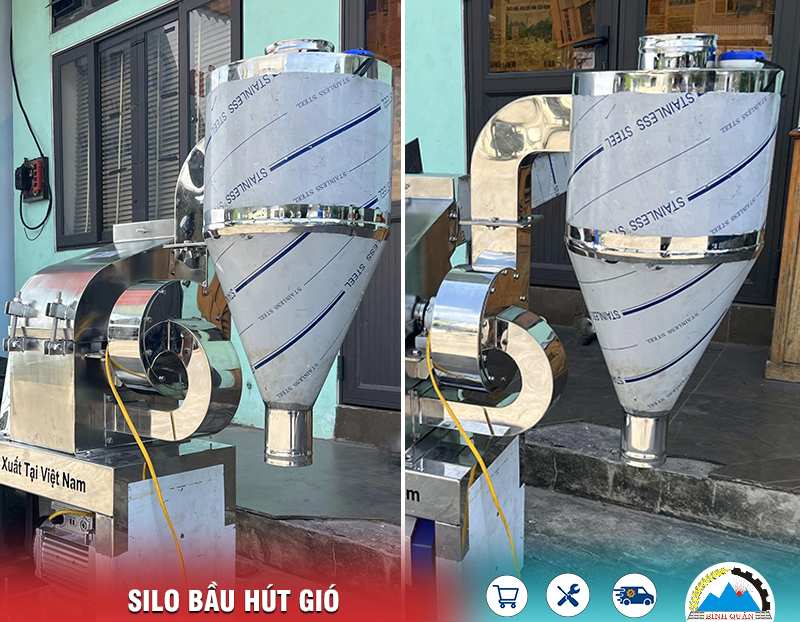 Silo bầu gió sẽ hút và chứa toàn bộ bột ngay khi được nghiền đưa xuống cửa xả điều này sẽ giúp quá trình nghiền không gây bụi - giảm thất thoát nguyên liệu