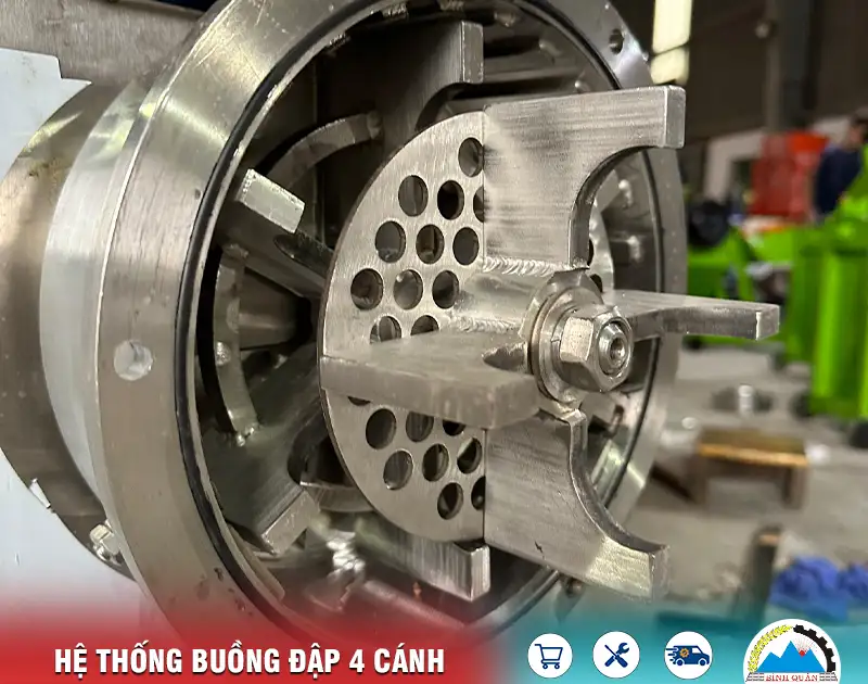 - Buồng thứ 1 là buồng phá: với 4 cánh quạt ngắn xoay tròn đập vỡ nguyên liệu với những thanh búa tĩnh gắn xung quanh trên thành máy.