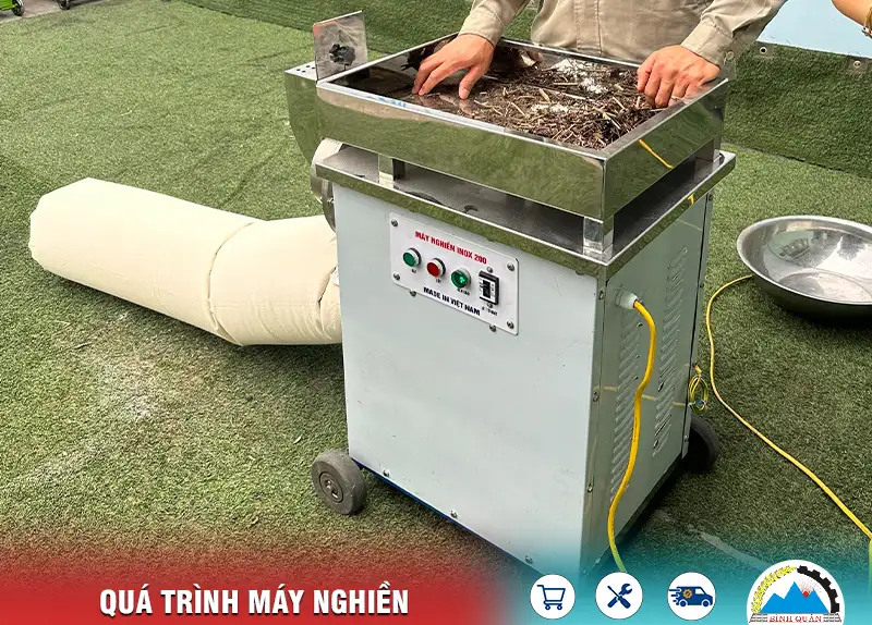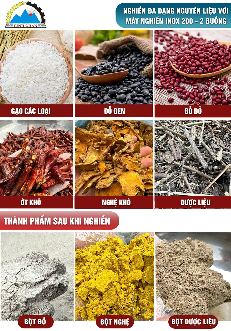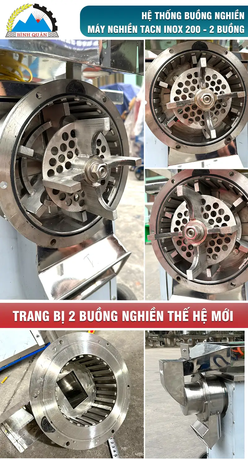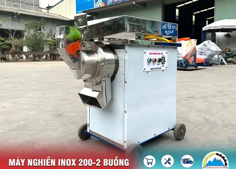 Máy nghiền inox 200 - 2 buồng do công ty Bình Quân sản xuất - thiết bị chuyên dùng nghiền các loại nông phẩm khô thành dạng bột mịn với năng suất đạt 25 - 30kg/giờ