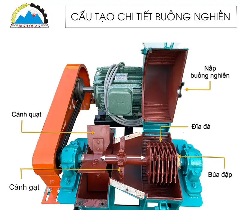 - Buồng nghiền là tổ hợp buồng đập và buồng nghiền nguyên liệu. Cho phép người dùng linh động điều chỉnh kích thước độ to hay mịn của thành phẩm mà không phải phụ thuộc vào mặt sàng