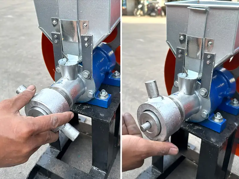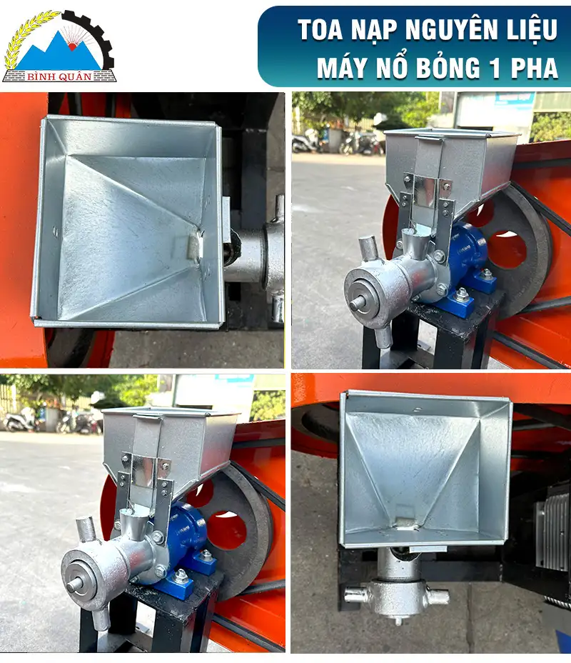 Toa nạp dạng phễu đứng, phía trước có tấm chắn cửa nạp và thân máy giúp người dùng điều chỉnh lượng nguyên liệu chảy xuống miệng bích bỏng và đi vòa trục xoắn