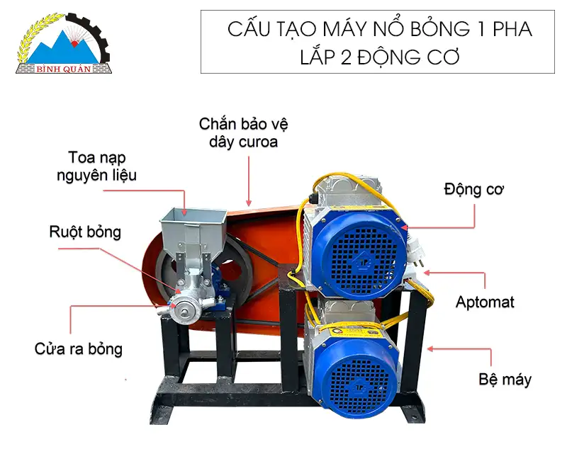 Máy nổ bỏng 1 pha do công ty Bình Quân sản xuất - giải pháp lý tưởng cho những ai muốn tự tay chế biến các loại bỏng gạo chín - giòn - xốp ngay tại nhà.