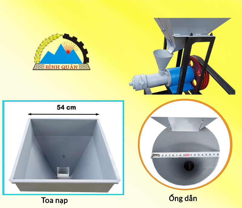 Máng nạp to rộng chứa đựng lớn lượng nguyên liệu, cùng tấm chắn ngang điều chỉnh lượng nguyên liệu chảy xuống thân máy.