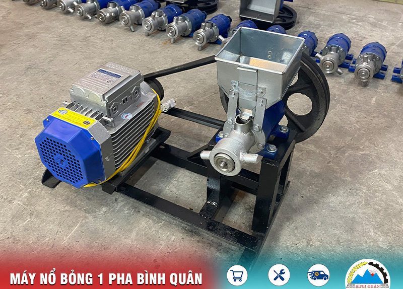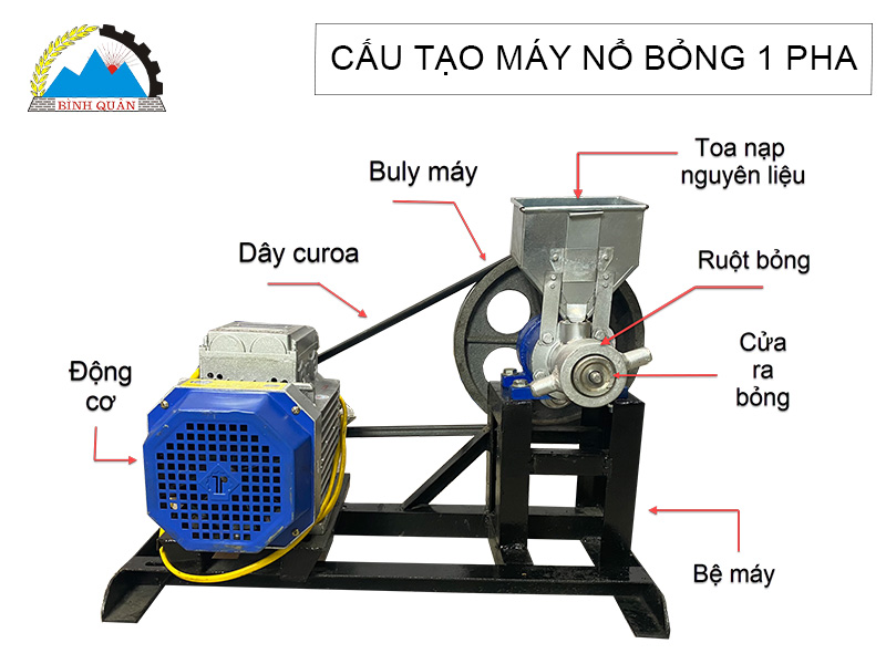 Khi máy hoạt động, motor quay chuyển động đến buồng làm việc. Lúc này, hệ thống ruột máy nổ bỏng gồm: ống vỏ và lõi xoắn sẽ nghiền nhỏ và ép nguyên liệu vào khuôn sẽ sinh ra nhiệt làm chín nguyên liệu đồng thời thổi phồng qua bép bỏng và đưa bột ra ngoài