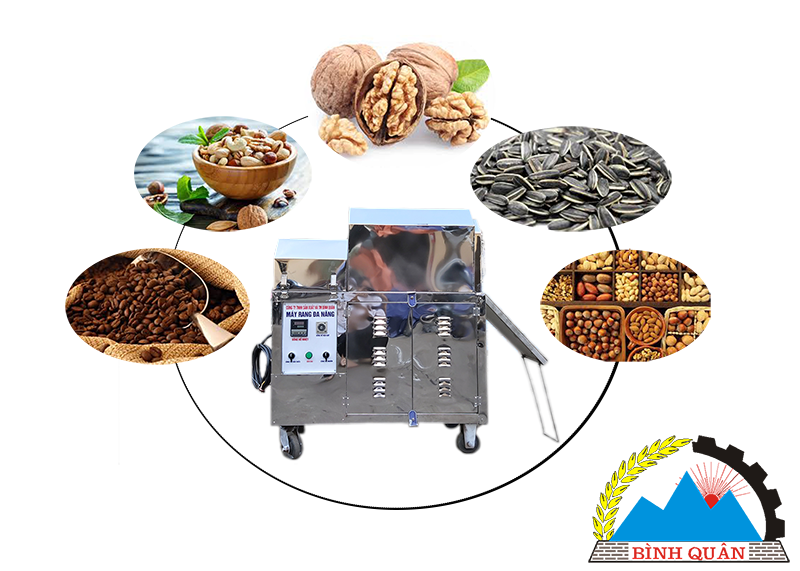 - Tính năng rang chín và đều các loại hạt: cà phê, đậu nành, lạc, hướng dương, các loại đỗ, hạt điều, óc chó, ...