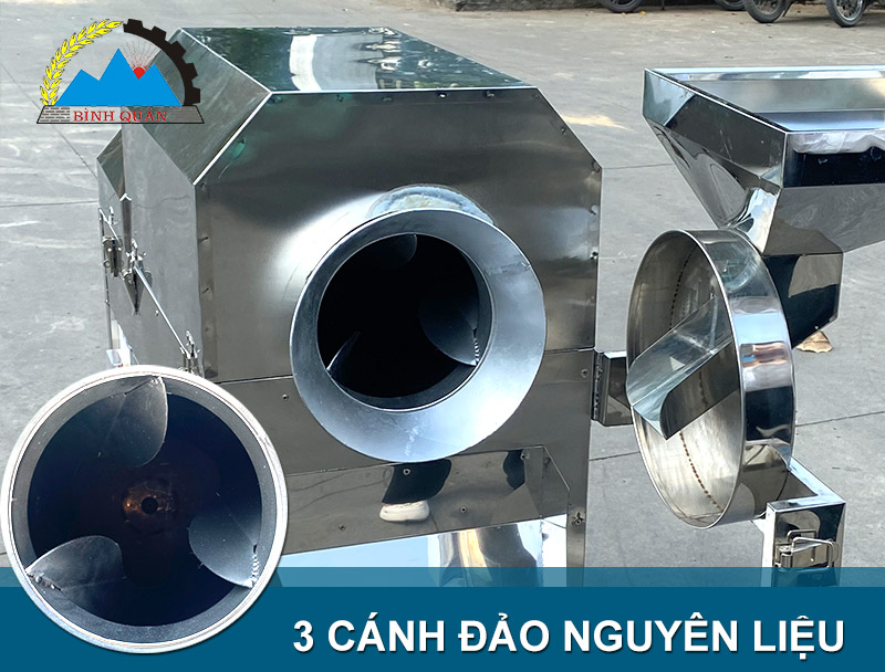 Bên trong lồng có 3 cánh đảo sẽ có nhiệm vụ quay tròn và đảo đều nguyên liệu đến khi cho thành phẩm chín giòn và không làm cháy xém.