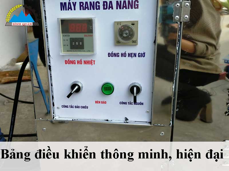 Đồ hồ cài nhiệt và đồng hồ hẹn giờ giúp bà con dễ dàng cài đặt thời gian, điều chỉnh nhiệt độ sao cho phù hợp với từng loại hạt cần rang. Công tắc đảo chiều có nhiệm vụ làm quay ngược lồng rang để di chuyển thành phẩm ra ngoài khi đã được làm chín.