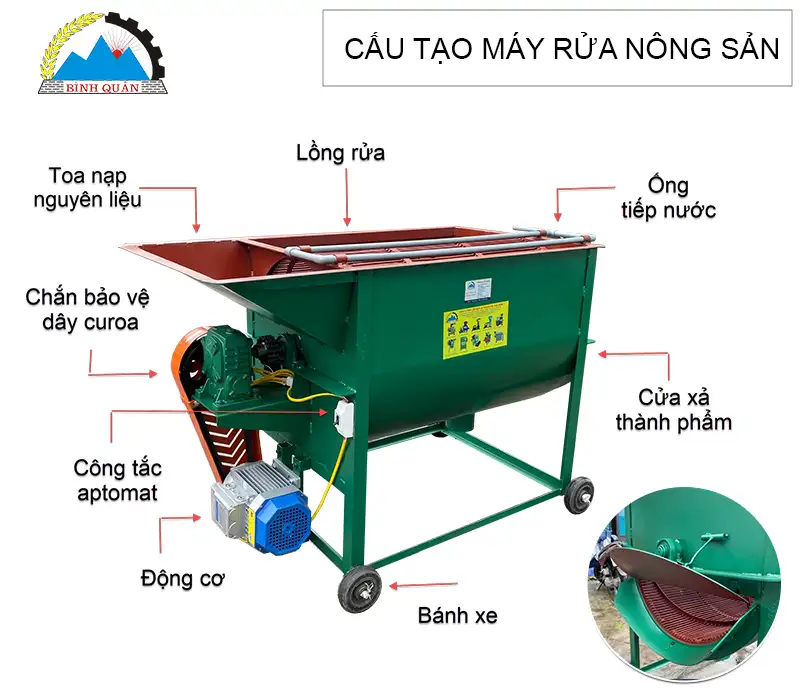 - Tính năng: Máy sử dụng giúp rửa sạch đất, bùn bám vào các loại củ, quả nông sản như: nghệ, riềng, củ đậu,...