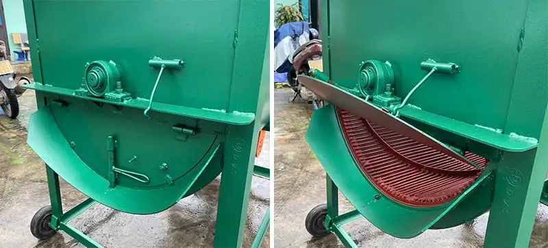 Khi tất cả được làm sạch, người dùng chỉ cần tháo chốt mở nắp cửa xả, nguyên liệu sẽ theo guồng quay đi ra ngoài cửa xả là có thể thu được thành phẩm