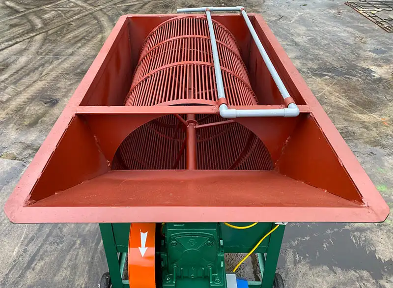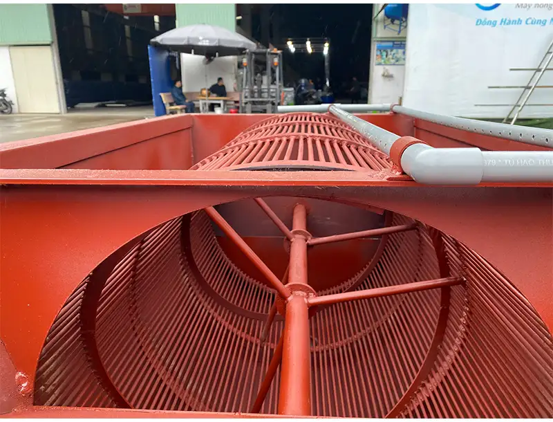 Nguyên liệu khi được đưa vào lồng rửa chuyên dụng, chúng sẽ được làm sạch lần lượt từ vị trí đầu đến cuối lồng rửa