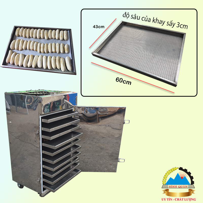 - Khay sấy được thiết kế độ sâu 3cm chứa được lượng nguyên liệu vừa phải cho các hộ kinh doanh vừa và nhỏ.