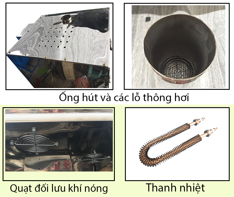Hệ thống tạo nhiệt sẽ bao gồm 2 thanh nhiệt chữ U cùng công suất 800W/ thanh. Ống hút và 2 quạt đối lưu khí nóng được lắp đặt để hút độ ẩm trong buồng làm việc giúp thực phẩm được khô đều, chất lượng.