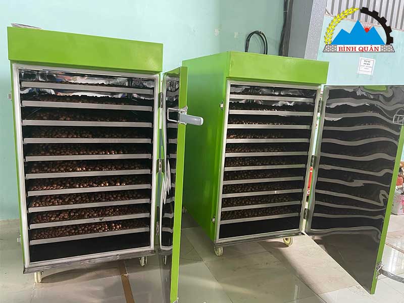 Bên trong máy được thiết kế 10 khay chứa to rộng, có thể chứa được từ 7 - 10kg nguyên liệu trên một khay. Kích thước của khay sấy là CD 90 * CR 76cm.