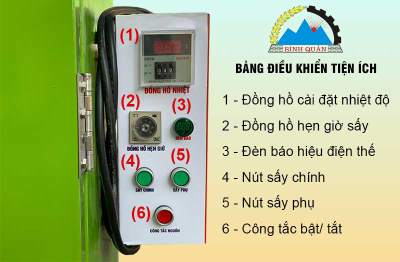 Bảng điều khiển thông minh bao gồm: công tắc nguồn, đèn báo, đồng hộ điều chỉnh nhiệt điện tử thông minh, đồng hồ hẹn giờ, sấy chính và sấy phụ.
