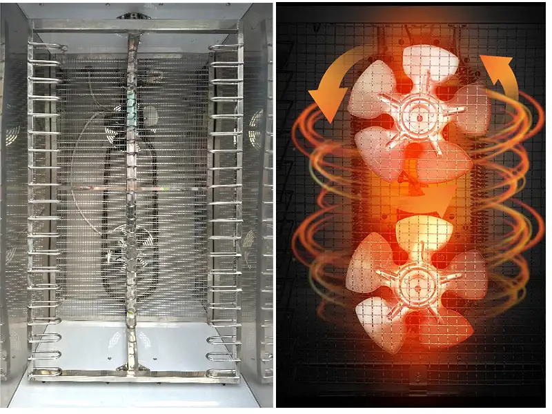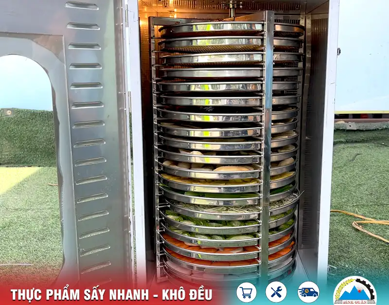 Nhằm đảm bảo mọi vị trí trên khay sấy được tiếp xúc đều với nguồn nhiệt của máy
