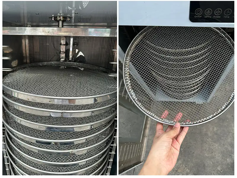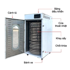 Khoang sấy được thiết kế kép kín, bên trong khoang gồm 20 tầng khay tròn dạng lưới. Khoảng cách giữa các tầng sấy khoảng 35mm đảm bảo nhiệt độ trải đều ở mỗi tầng