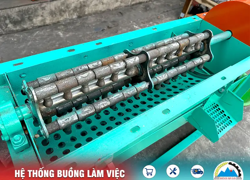 Sau khi hạt được tách, chúng sẽ đi qua sàng lỗ bên dưới rồi theo hệ thống sàng rung thoát ra ngoài cửa xả