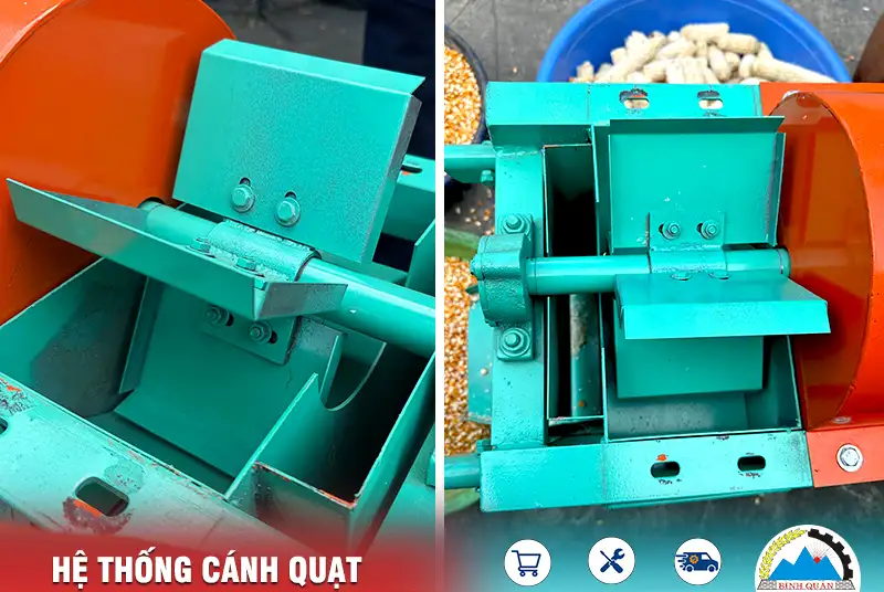 Hơn nữa, bên cạnh buồng tách hạt là hệ thống cánh quạt tạo gió thổi, đẩy bớt phần vỏ lụa, mày ngô và bụi mịn trong quá trình tách ra cửa xả phía sau