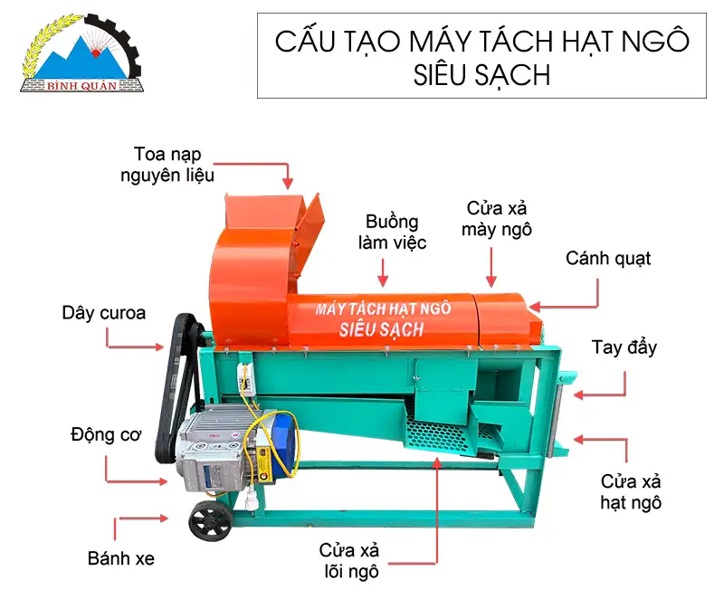 Máy tách hạt ngô siêu sạch do công ty Bình Quân sản xuất - trợ thủ không thể thiếu cho mọi trang trại trồng ngô, cơ sở làm cám, hay hộ chăn nuôi quy mô lớn.