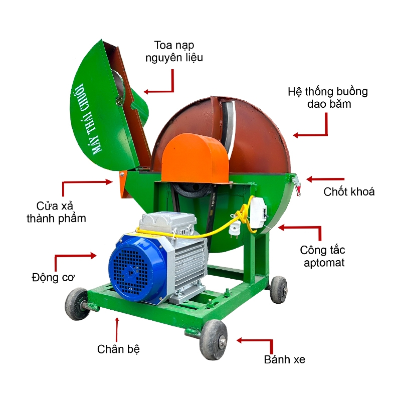 Máy thái chuối sử dụng động cơ 2,2kw dùng điện gia đình 220V motor lõi dây đồng 100% dây curoa kết nối giữa các buly truyền lực từ động cơ tới buly máy vào buồng băm