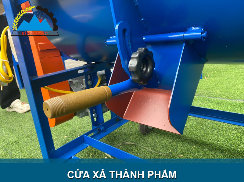 Thành phẩm sau khi trộn được đưa trực tiếp ra ngoài cửa xả, trước cửa xả có nắp chắn thuận tiện cho người dùng điều chỉnh: