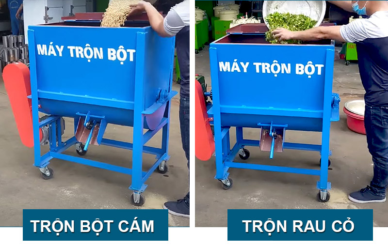 - Máy trộn nguyên liệu nằm ngang được sử dụng để trộn đều các loại bột gạo, bột ngô, trộn bột cám với rau củ băm nhỏ làm thức ăn trực tiếp cho vật nuôi ….Máy có thể đảo trộn được bột khô và bột ướt.