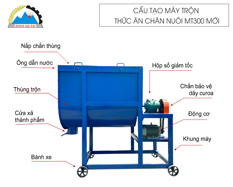 Máy trộn thức ăn chăn nuôi MT300 do công ty Bình Quân sản xuất - giải pháp giúp bà con phối trộn bột cám và các loại nguyên liệu làm thức ăn chăn nuôi; đến các cở sở sản xuất