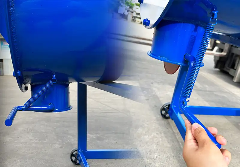 Thùng trộn có nắp đậy kính, tránh văng bắn nguyên liệu ra ngoài khi vận hành. Sau khi hoàn tất quá trình, nguyên liệu được xả trực tiếp ở cửa đáy thùng.