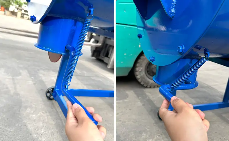 Thành phẩm sau khi trộn được xả thẳng trực tiếp dưới đáy thùng, trước cửa xả có nắp chắn thuận tiện cho người dùng điều chỉnh: