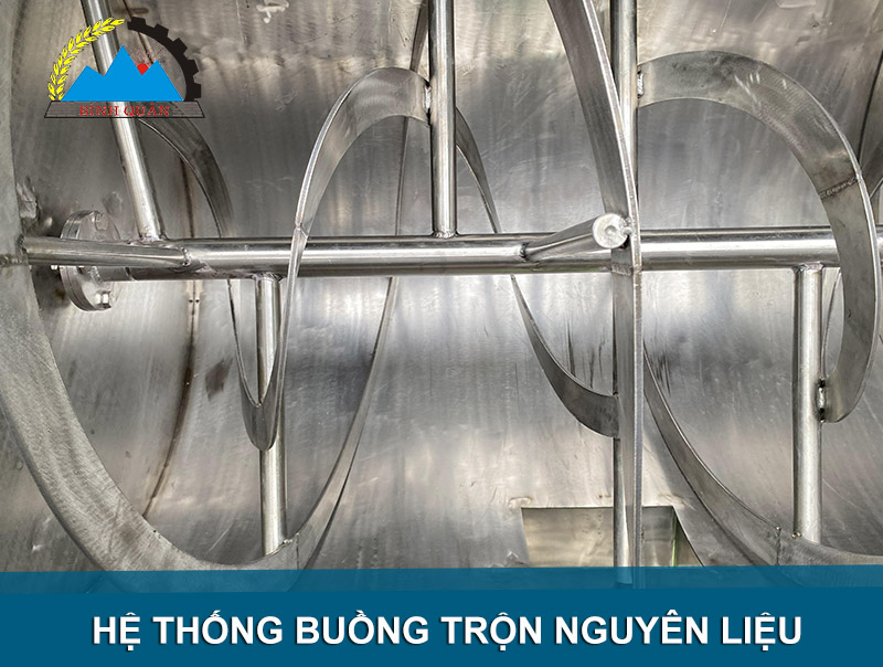 Bên trong các cánh trộn được thiết kế dạng xoắn giúp quá trình trộn đều hơn và thời gian trộn nhanh hơn không để nguyên liệu dồn về một góc